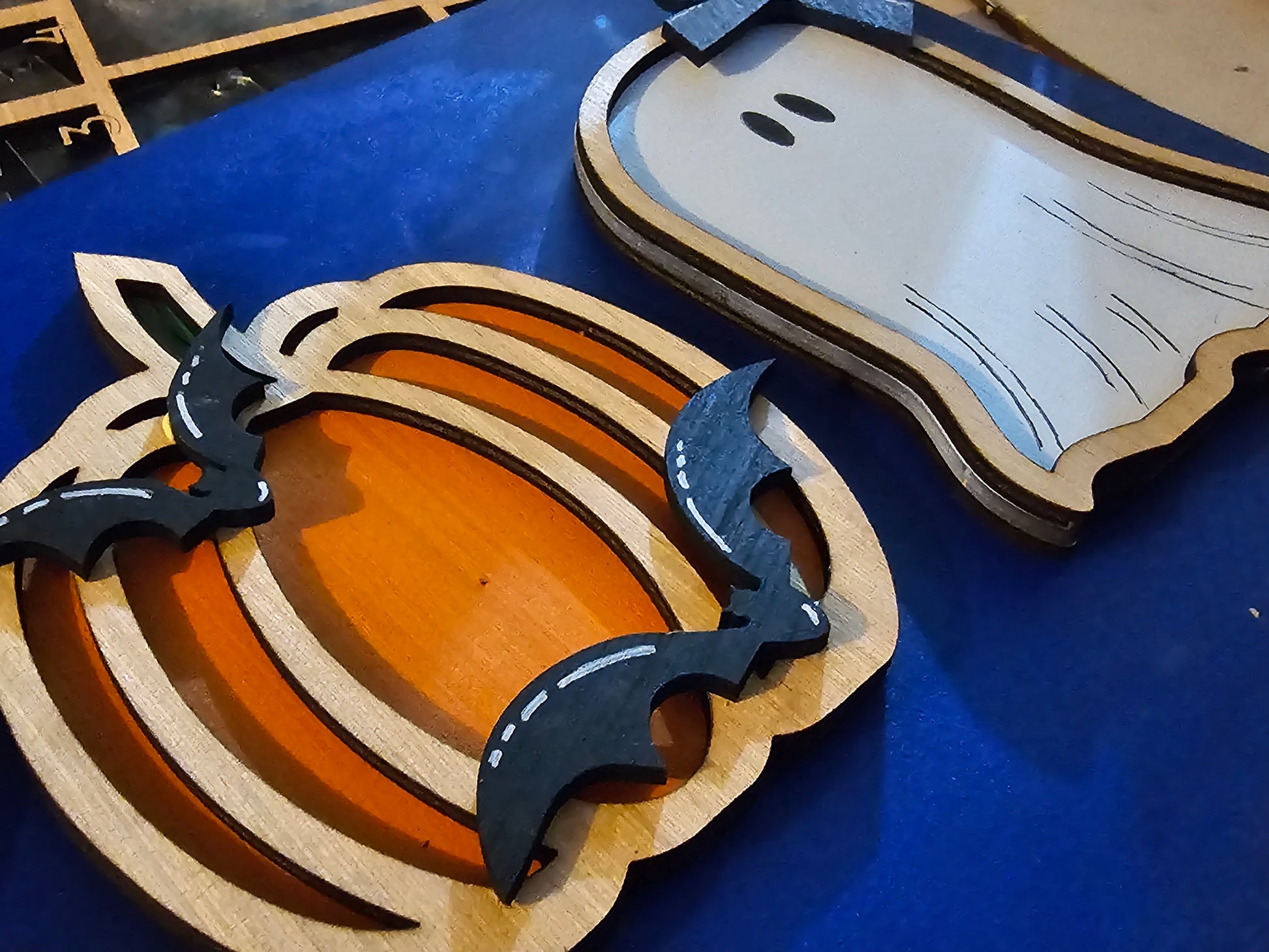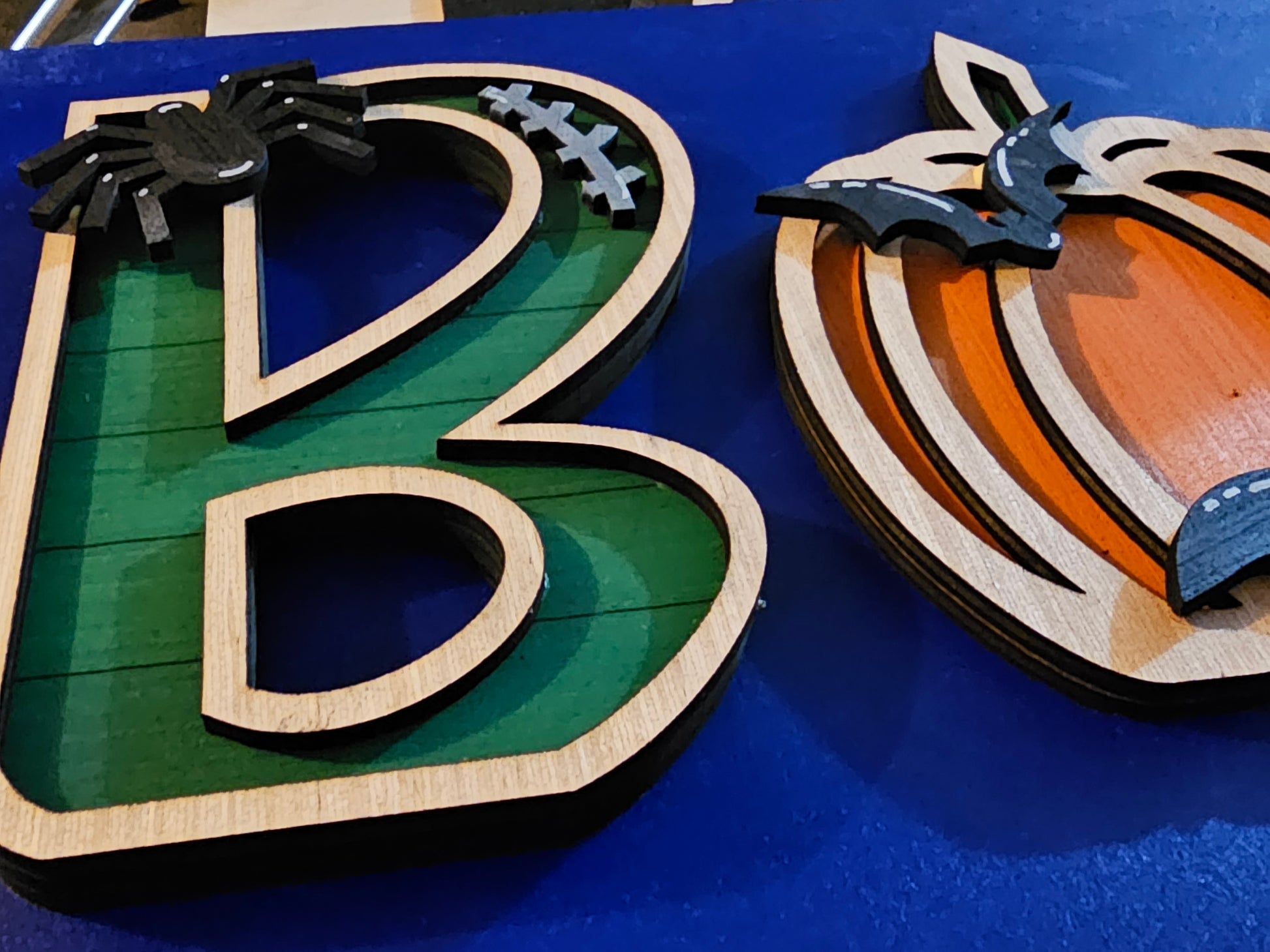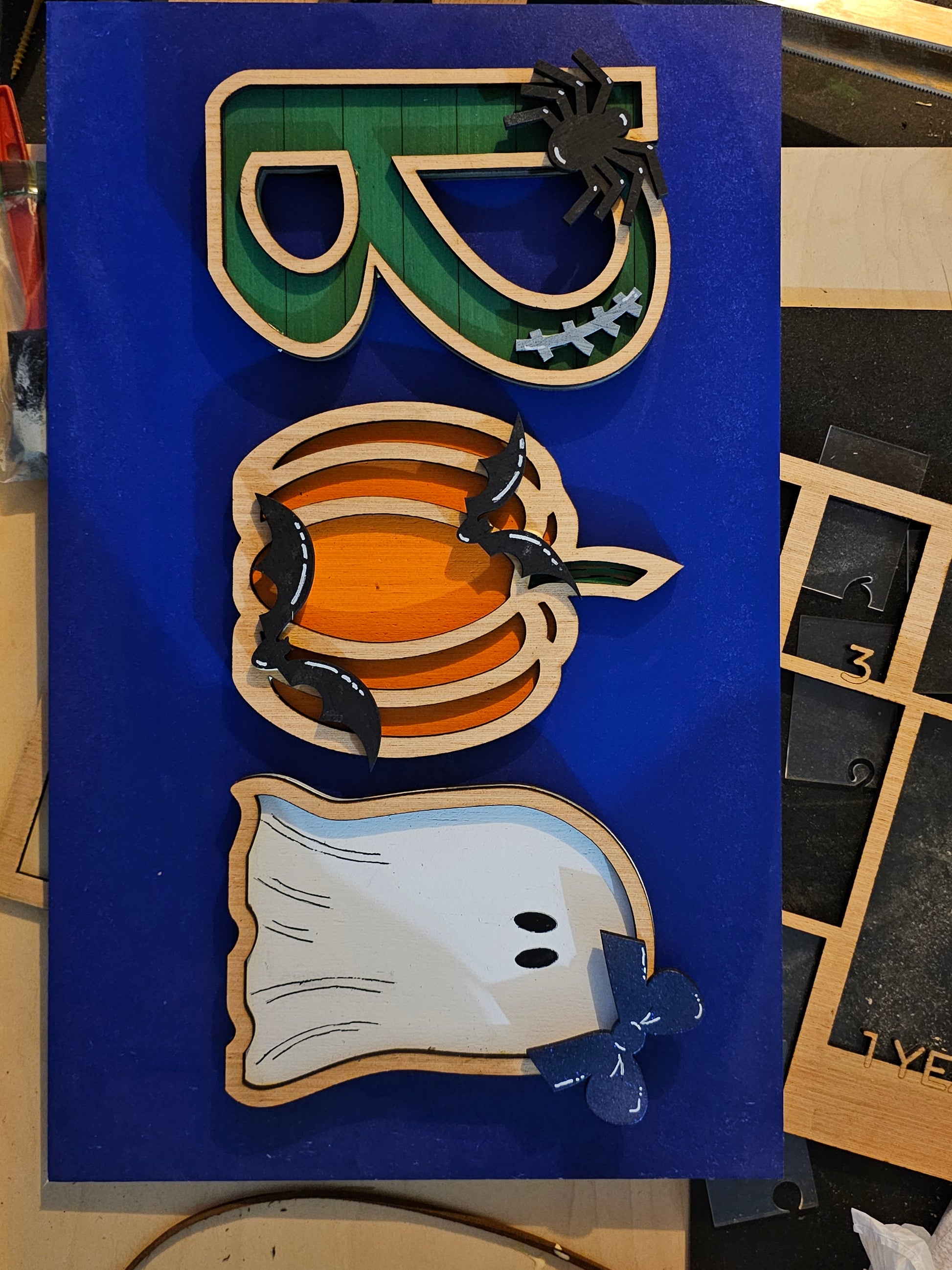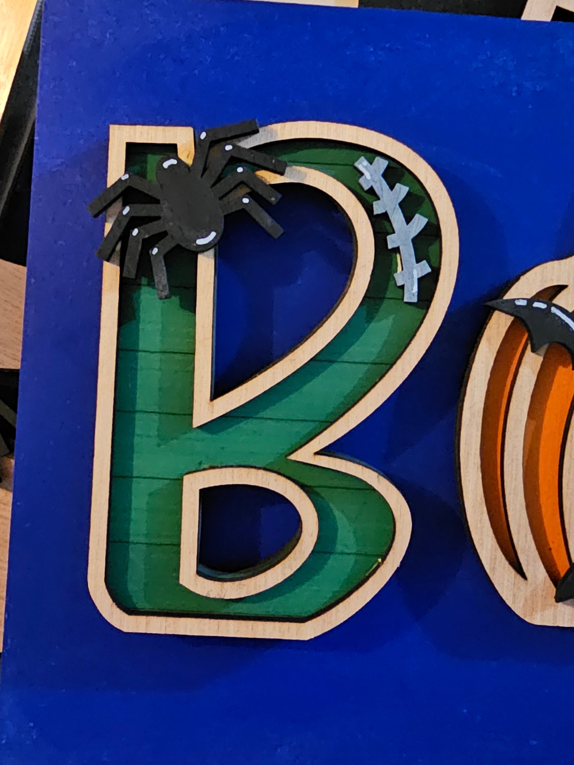 The Adorable Halloween "Boo" shelf sitter consists of hand-crafted and assembled decorations featuring Frankenstein, a pumpkin, and a ghost. Frankenstein is represented by the letter "B," the pumpkin by the letter "O," and the ghost also by the letter "O." These decorations are designed to sit on a shelf and add a charming and spooky touch to your Halloween ambiance. The little bats and spiders make the set just to cute!