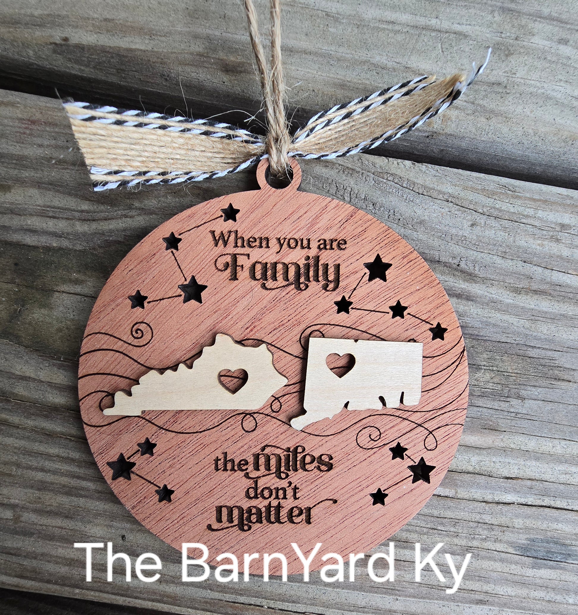 The engraving, done in a graceful script, is centered at the top half of the ornament. Below the inscription, the focal point is a beautiful arrangement of maple wood shapes, representing the states where your family members live. The maple is a light, natural wood that contrasts wonderfully against the darker mahogany background, drawing attention to the intricate shapes.