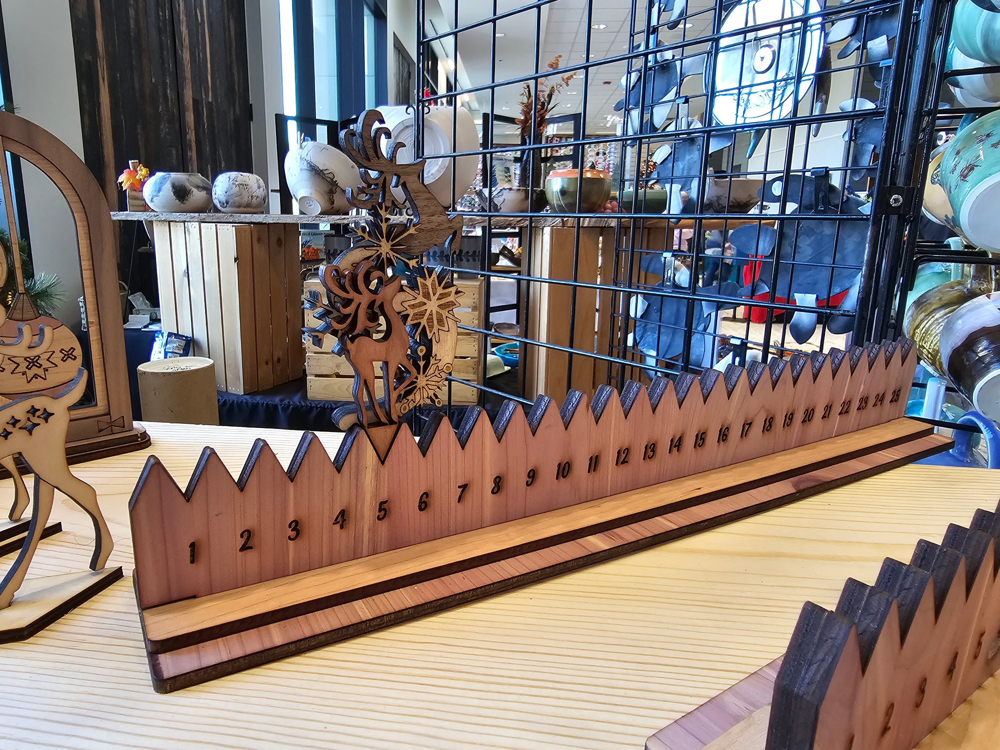 Mark the days counting down to Christmas with this Stunning 20 inch long advent calendar with a marker of 3 deer done in walnut, maple and mahogany. Set upon a base of cedar and birch. Perfect piece for a mantle or center piece of any Christmas display!