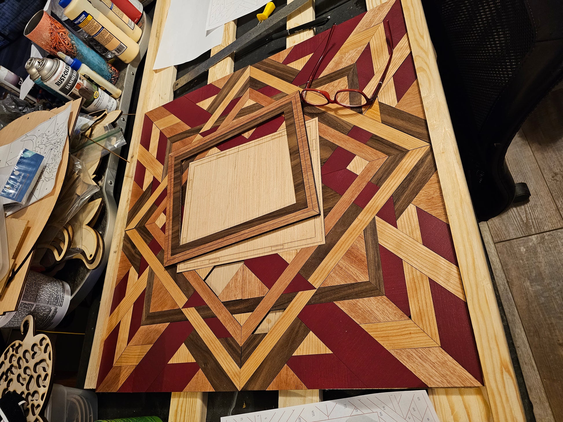 This exquisite handmade photo frame from Hodgenville, KY elegantly showcases an 8x10 picture within its 24x24 dimensions. Crafted with precision, it features a mosaic-like pattern of 146 carefully chosen pieces of walnut, cherry, birch, and mahogany woods. Meticulously oiled and assembled, the frame's rich colors and textures beautifully highlight the artistry of the woodwork. To add a personalized touch, you can select your preferred accent color to complement the overall design and make it yours.