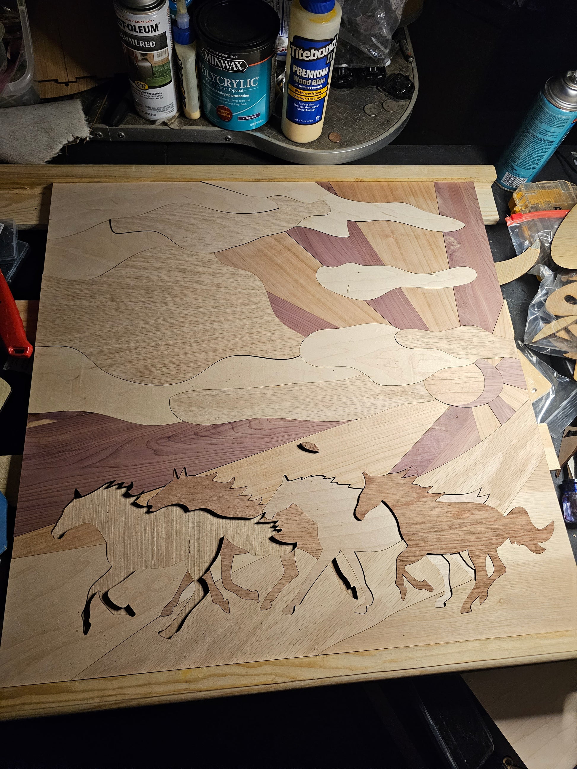Made with cedar, oak, mahogany, saple, cherry and walnut. Varying Layered depths to create texture.