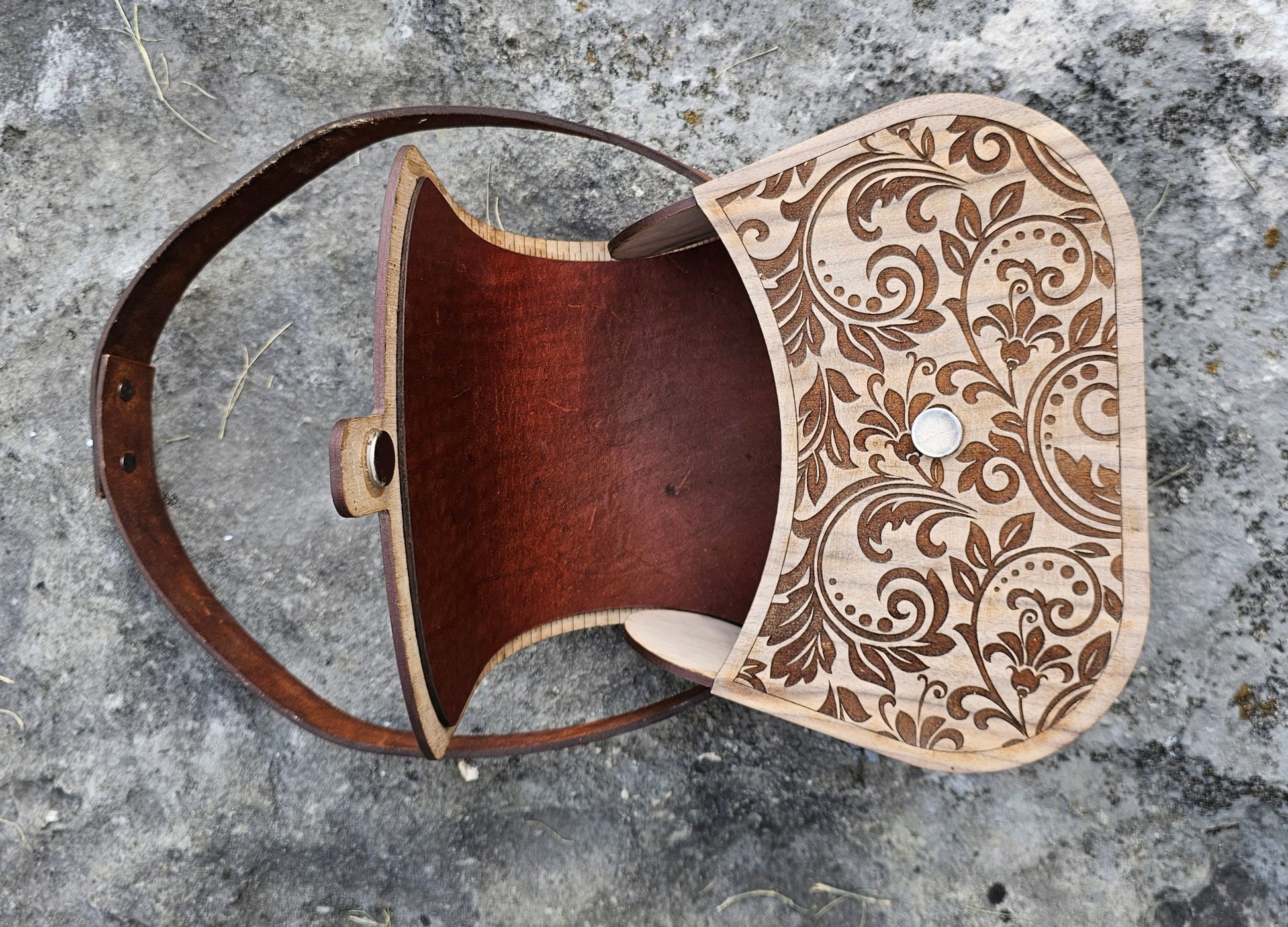 Stay stylish in the West with this one-of-a-kind handcrafted purse. Constructed from Walnut wood and leather, the Western design is etched onto the exterior with a magnetic snap closure, real leather handle, and leather lining. Perfectly combining art and functionality, you'll be riding off into the sunset in style.